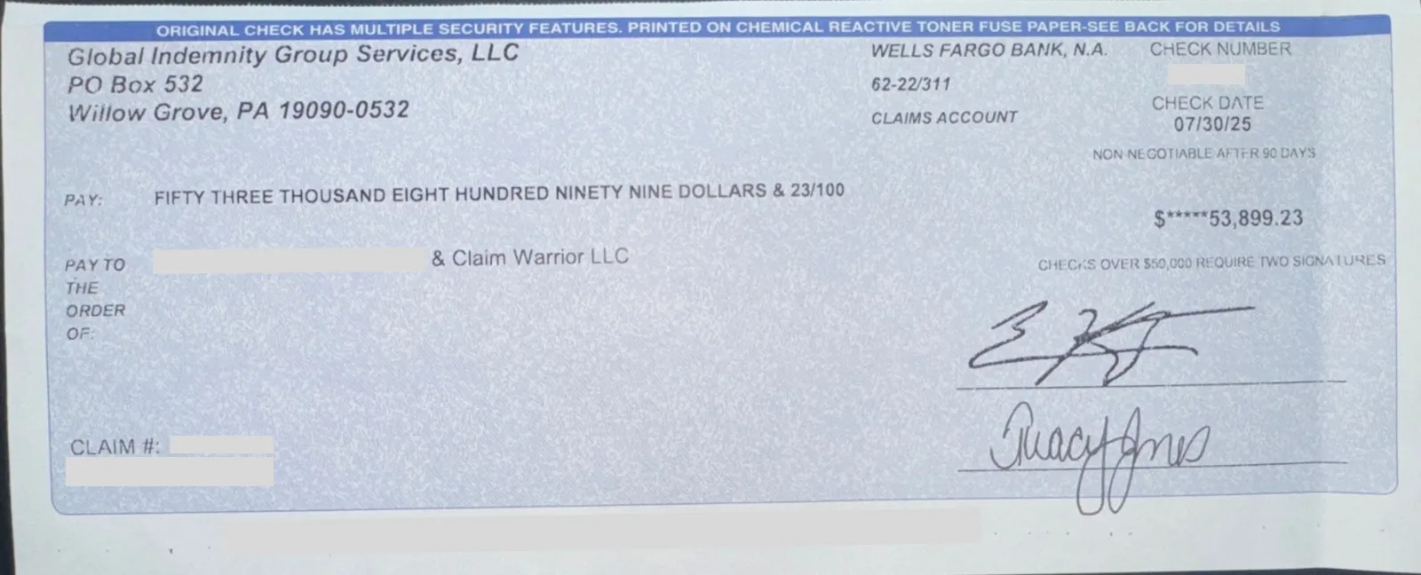 Verified fire insurance settlement check confirming the $53,899.23 payout, with all personal information redacted.