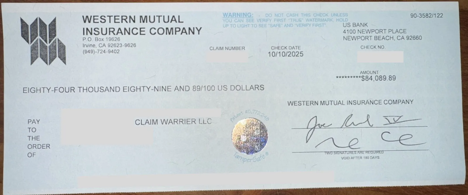 Verified settlement check confirming the $84,089.89 fire claim payout (all personal information redacted).