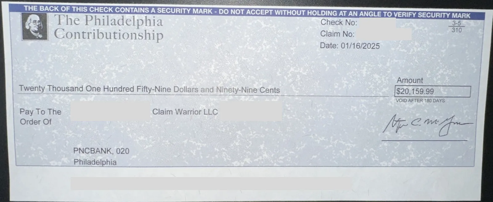 Verified settlement check confirming the $20,159.99 payout (all personal information redacted).