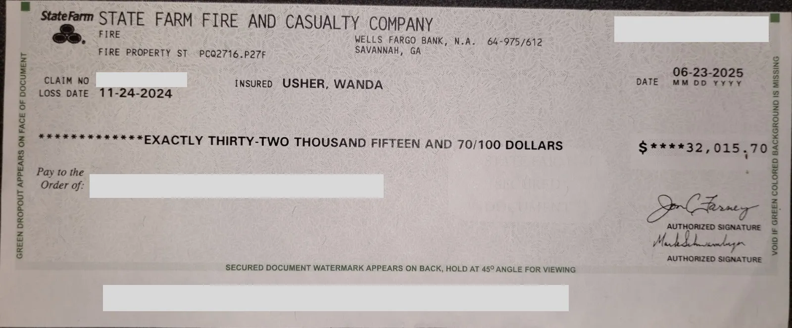 Verified settlement check confirming the $32,771.93 payout (all personal information redacted).